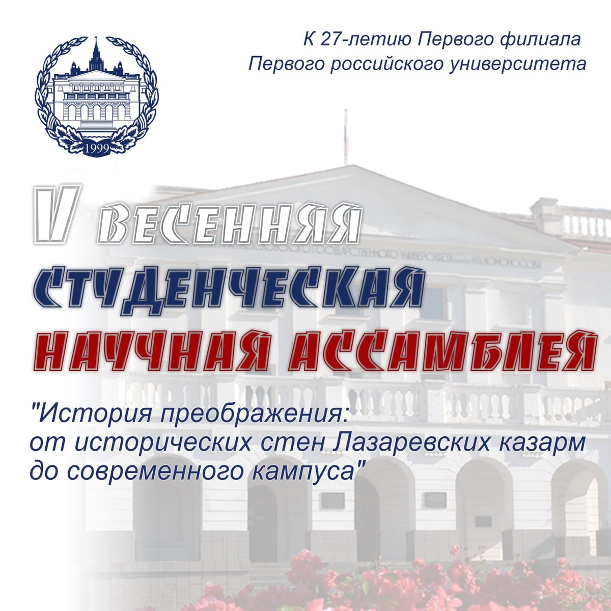 ! 🗓 С 1 апреля 2026 года начнется работа V-й Весенней студенческой научной ассамблеи на тему «История преображения: от исторических стен Лазаревских казарм до современного кампуса», приуроченная к 27-летию основания Первого Филиала Первого российского университета План мероприятий: 1 апреля: 📌16:15–18:00 – Открытие V Весенней студенческой научной ассамблеи. Представление и обсуждение студенческих докладов. Аудитория 369, учебно-административный корпус Филиала. 2 апреля: 📌 16:15–18:00 – Продолжение работы Ассамблеи: представление и обсуждение студенческих докладов. Аудитория 369, учебно-административный корпус Филиала. 3 апреля: 📌 15:00 – Торжественное собрание коллектива Филиала, приуроченное к 27-летию основания Первого Филиала Первого российского университета. Подведение итогов V Весенней студенческой научной ассамблеи. 📌 16:00 – Праздничный концерт Ансамбля песни и пляски Краснознаменного Черноморского флота. Актовый зал культурно-досугового центра Филиала. Полная прог