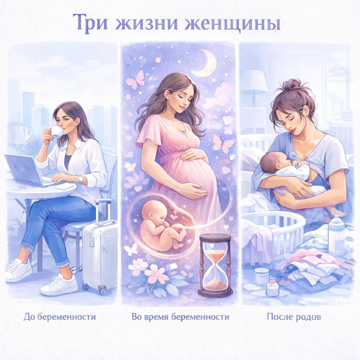 Жизнь до беременности, жизнь во время беременности, и жизнь после родов – это не этапы одной и той же реальности, а три разные жизни, с разными законами, скоростями и требованиями к женщине. Проблемы начинаются там, где общество и сама женщина делают вид, что это «просто продолжение». Жизнь ДО беременности Это жизнь автономной взрослой женщины. Даже если в ней есть: • усталость • перегруз • тревога • нерешённые вопросы – тело всё ещё живёт на своих ресурсах. В этой жизни: • энергия направлена вовне • тело принадлежит женщине • решения принимаются относительно себя • социальная идентичность стабильна Можно: • не спать ночь и восстановиться • пропустить приём пищи и «догнать» позже • долго терпеть, сжиматься, вытягивать Тело справляется. Цена есть, но она отложенная. Жизнь ВО ВРЕМЯ беременности Это уже не автономия. Это жизнь двух систем в одном теле. Беременность – не «особое состояние», а фундаментальная перестройка: • гормональной регуляции • метаболизма • н
