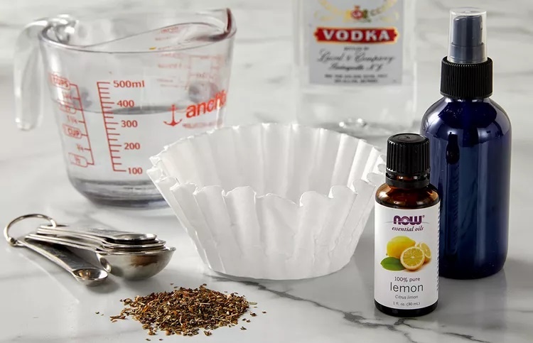 Процедите настой через воронку с кофейным фильтром в бутылку с распылителем. Добавьте ¾ стакана дистиллированной воды, столовую ложку водки и пять капель эфирного масла лимона. Плотно закройте бутылку и встряхните.