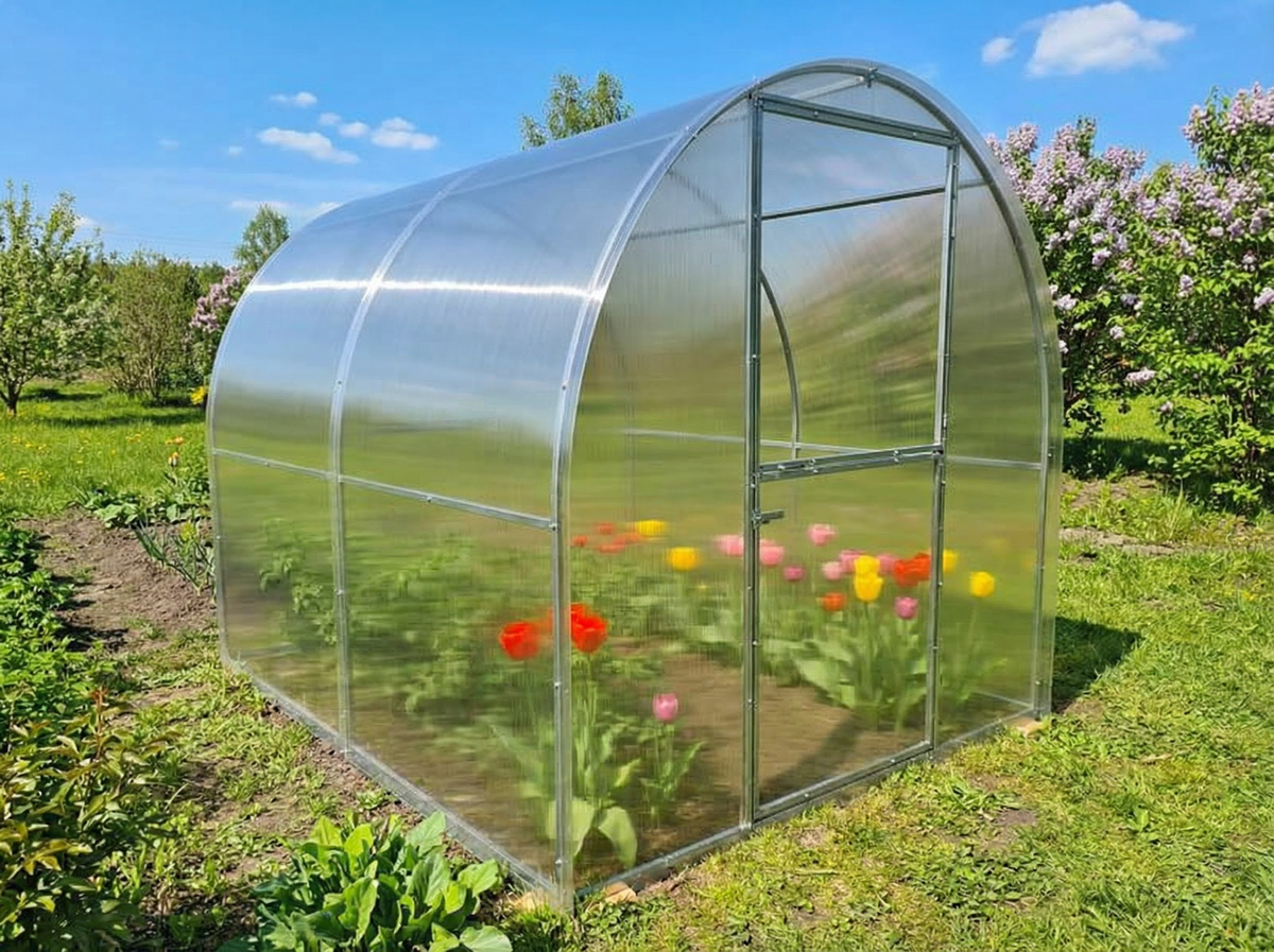 Российский завод-изготовитель с упором на поликарбонатные теплицы с усиленным каркасом. Ассортимент заточен под стандартные дачные участки: длина от 4 до 8 метров, несколько вариантов толщины поликарбоната (4 мм, 6 мм, 8 мм — от тонкой плёнки до серьёзного укрытия). Поликарбонат толщиной 4 мм подходит для весенне-летнего сезона, 6–8 мм — для круглогодичного использования.