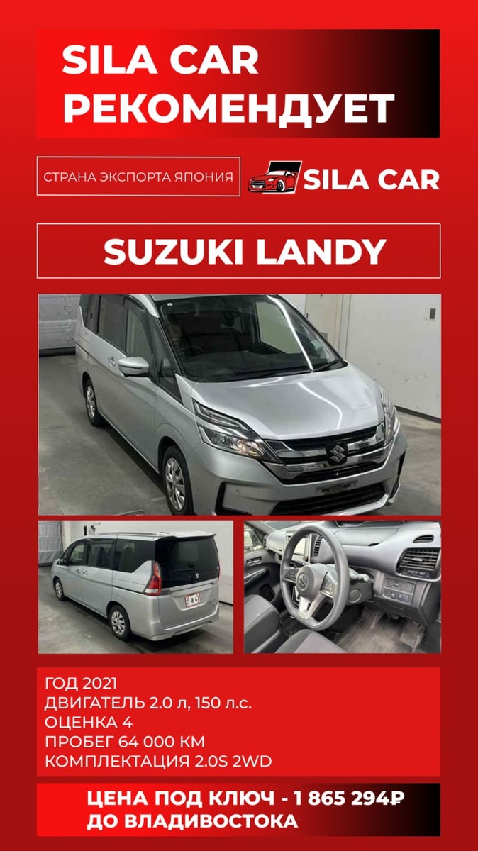 Автомобиль в наличии в Японии! ┏ Реально честная комиссия: ┣ 50 000₽ на авто до 1 млн ₽ ┣ От 1 до 2,5 млн. ₽ - 70.000₽ ┗ От 2,5 млн. ₽ - 100.000₽ ❗️SUZUKI LANDY в продаже🚗 🔥SUZUKI LANDY 📍Год: 2021 📍Двигатель: 2.0 л / 150 л.с. 📍Пробег: 64 000 км 📍Оценка 4 📍Комплектация: 2.0S 2WD ❤️🔥 ЦЕНА ПОД КЛЮЧ: 1.865.294₽ 📍Для консультации и брони автомобиля пишите старшему менеджеру Дмитрию 📱+7(908) 979-36-92 📱 @SilaCarDm 👉Для РАСЧЕТА СТОИМОСТИ АВТО жмите сюда💪 💻Самостоятельный расчет на нашем сайте: silacar.ru Или звоните: +79084532873 ❗️А для тех, кого интересует АВТОКРЕДИТ : +79147036533 Не грузит фото? Мы в MAX 📱 ДОРОГО НАСЧИТАЛИ? Напиши нам📍БЕСПЛАТНО ПРОВЕРИМ РАСЧЕТ КОНКУРЕНТОВ НА СКРЫТУЮ КОМИССИЮ 👆🏼❗️ СИЛА КАР – СИЛА В ПРАВДЕ💪