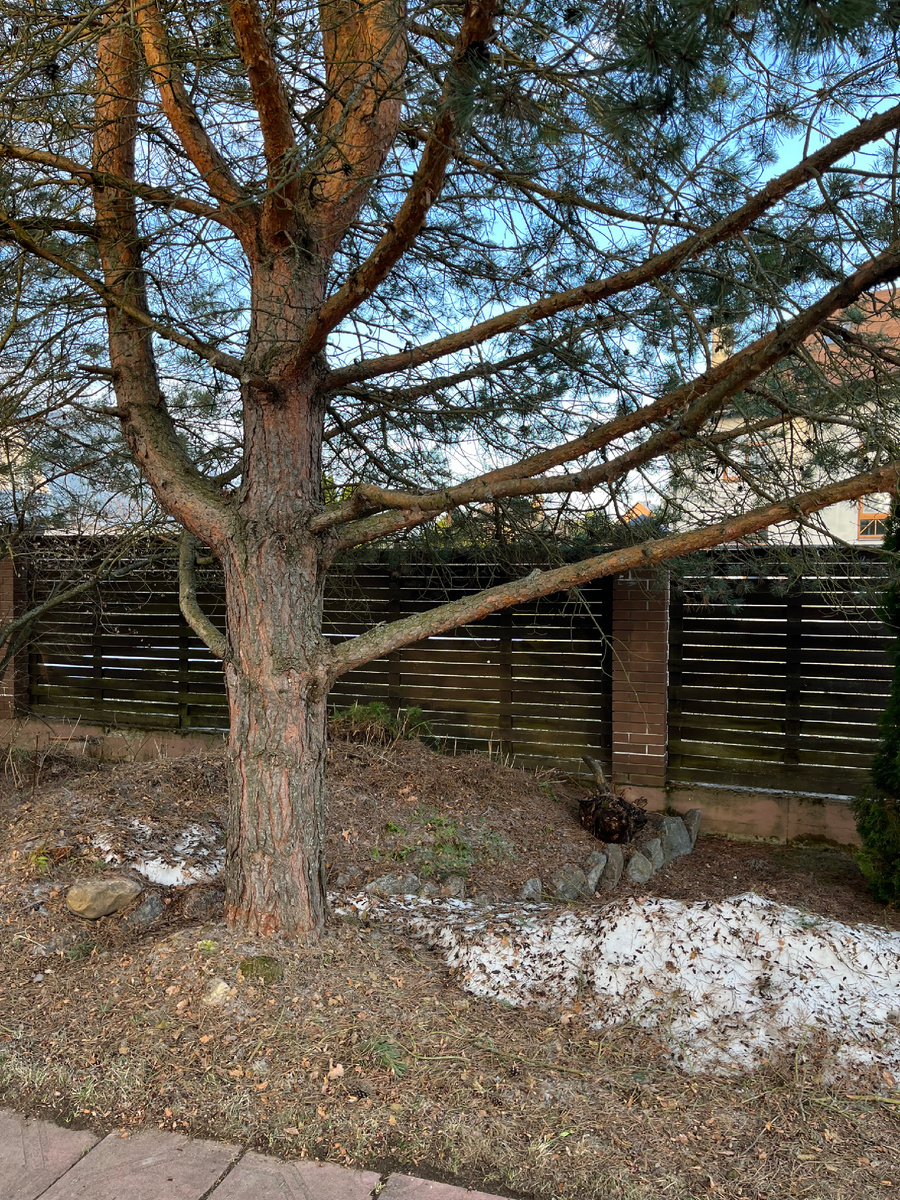Вот одним утром обломала сухие нижние ветки с сосны, и стала она более прилично смотреться, а то сухие палки чуть не до земли торчали.
