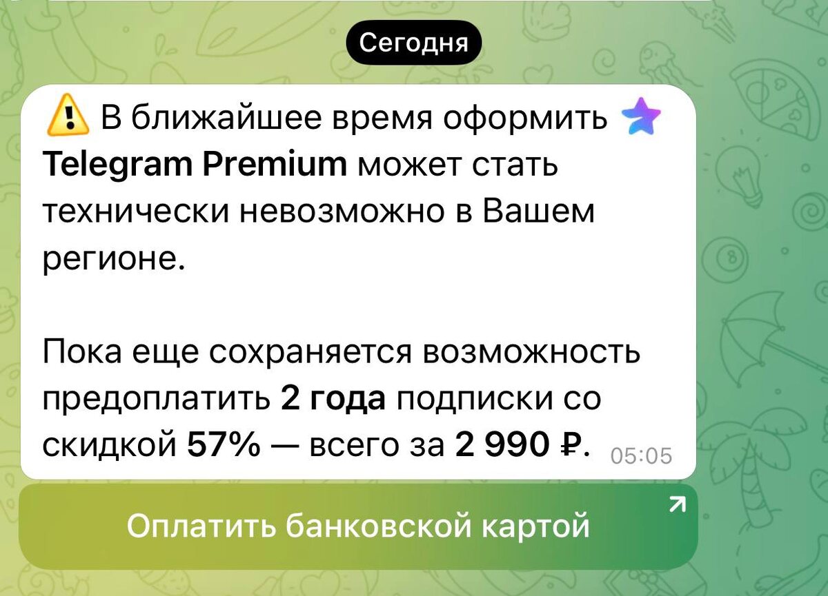 «В ближайшее время оформить Telegram Premium может стать технически невозможно в Вашем регионе», - говорится в сообщении мессенджера. Пользователям предлагается заранее оплатить два года премиум-подписки. Ранее аналогичные сообщения получили и те владельцы Apple, которые пополняли свой баланс Apple ID напрямую со счета мобильного телефона - вскоре эту возможность им отключат. Новости Омска в Max. Подписаться