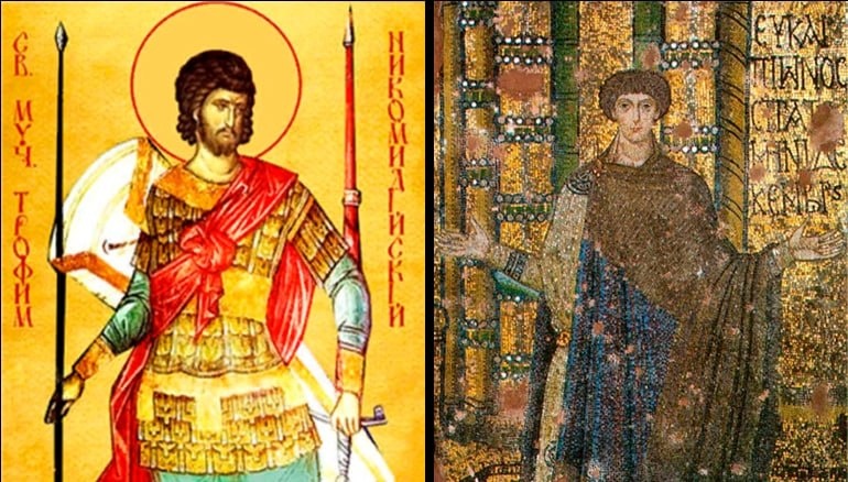 Мученик Трофим Никомидийский жил в III веке, во время гонения на христиан при императоре Диоклетиане. Он вместе с мучеником Евкарпием служил телохранителем правителя провинции Вифиния, был одним из самых преданных его слуг и ненавистником христиан. Трофим и Евкарпий предавали сторонников Христа жестоким мучениям. Однажды, когда они разыскивали христиан, перед ними появилось огненное облако, из которого раздался голос, призывающий их самих присоединиться к верующим во Христа Спасителя, чтобы наследовать Царствие Небесное. Воины увидели в облаке Светлого Мужа и множество предстоящих ему. Пораженные Трофим и Евкарпий исповедали Единого Истинного Бога и покаялись в своих злодеяниях. Духовно переродившись после случившегося с ними чуда, они выпустили из темницы всех томившихся там христиан, за что сами были преданы страшным истязаниям. Но мученики только благодарили Господа, надеясь, что Он простит их грехи и они скоро присоединятся к воинству Царя Небесного. Мученики Трофим и Евкарпий бы