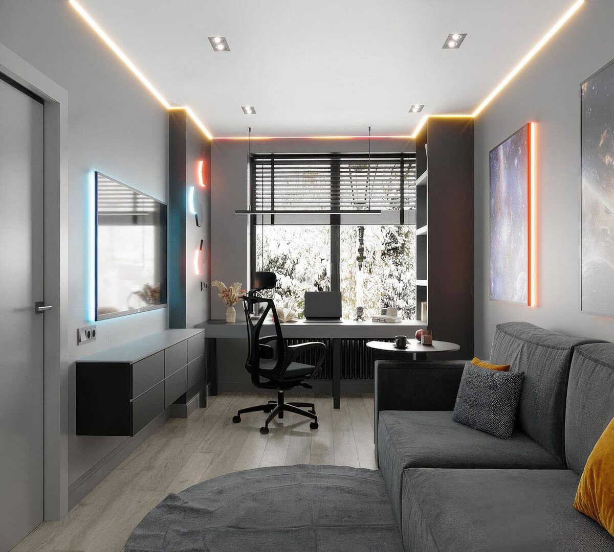 Кабинет Компактное рабочее пространство с акцентом на оформление и свет. Картины и подсветка создают атмосферу и добавляют глубины без перегруза. Кухня-гостиная Единое пространство, где кухня аккуратно встроена и не перетягивает внимание. Зона отдыха мягкая и уютная за счёт текстиля и света. Спальня Спокойная зона для отдыха с акцентом на текстуры и мягкое освещение. Всё выстроено так, чтобы создать ощущение уюта и тишины. Прихожая + гардеробная Объединённое пространство с интегрированным хранением без визуального шума. Подсветка и стеклянные фасады делают зону лёгкой и аккуратной. Санузел Тёмная палитра с акцентом на фактуру и глубину материалов. Подсветка и лаконичные формы создают атмосферное и цельное пространство.