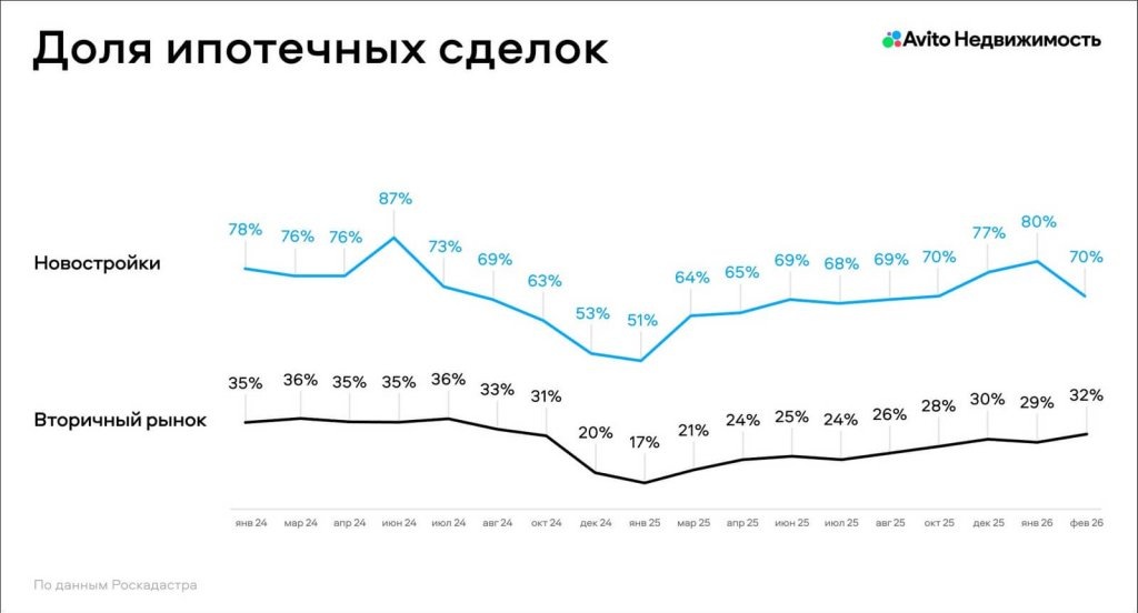 🪖 Доля ипотечных сделок на вторичном рынке в феврале выросла до 32% — Авито Недвижимость