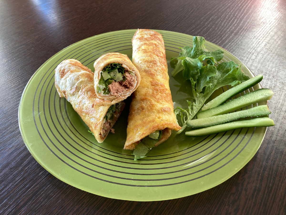 Перекладываем на тарелку, смазываем творожным сыром. На один край выкладываем тунец