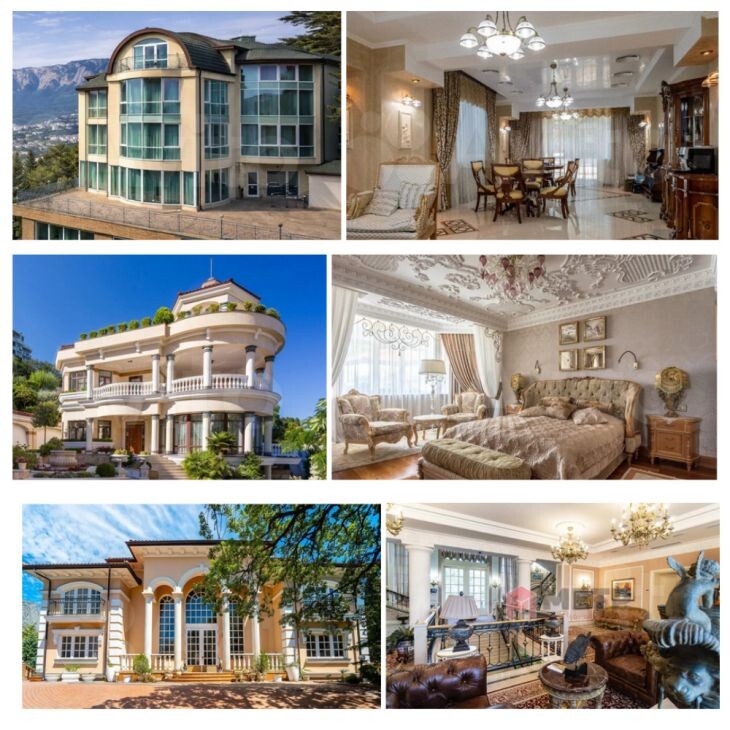 Открывает подборку резиденция в Ялте площадью 1 360 кв. м за 787 млн рублей. Четырехэтажный кирпичный дом расположен в 150 м от моря. Согласно описанию, внутри — двенадцать спален, каждая с собственным санузлом, гардеробной и балконом с видом на море и горы. Интерьеры укомплектованы итальянской мебелью. В доме установлен лифт. На первом и цокольном этажах — SPA-зона с бассейном длиной 17 м, парной, джакузи, душевыми, тренажерным залом и комнатой отдыха. Также обустроен винный погреб. На территории — теннисный корт, беседки, двухэтажный гостевой дом (на первом этаже комната для персонала, на втором — две спальни с санузлами), закрытый гараж на три автомобиля и крытый бокс для катера. В доме установлена гелиосис
