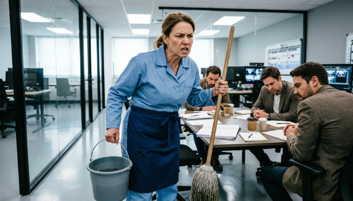 Дверь распахнулась широко, с характерным скрипом, который в тишине кабинета прозвучал как выстрел. Все головы повернулись к ней. Три пары глаз в дорогих очках и два взгляда своих коллег уставились на женщину в синем комбинезоне с тележкой для уборки.