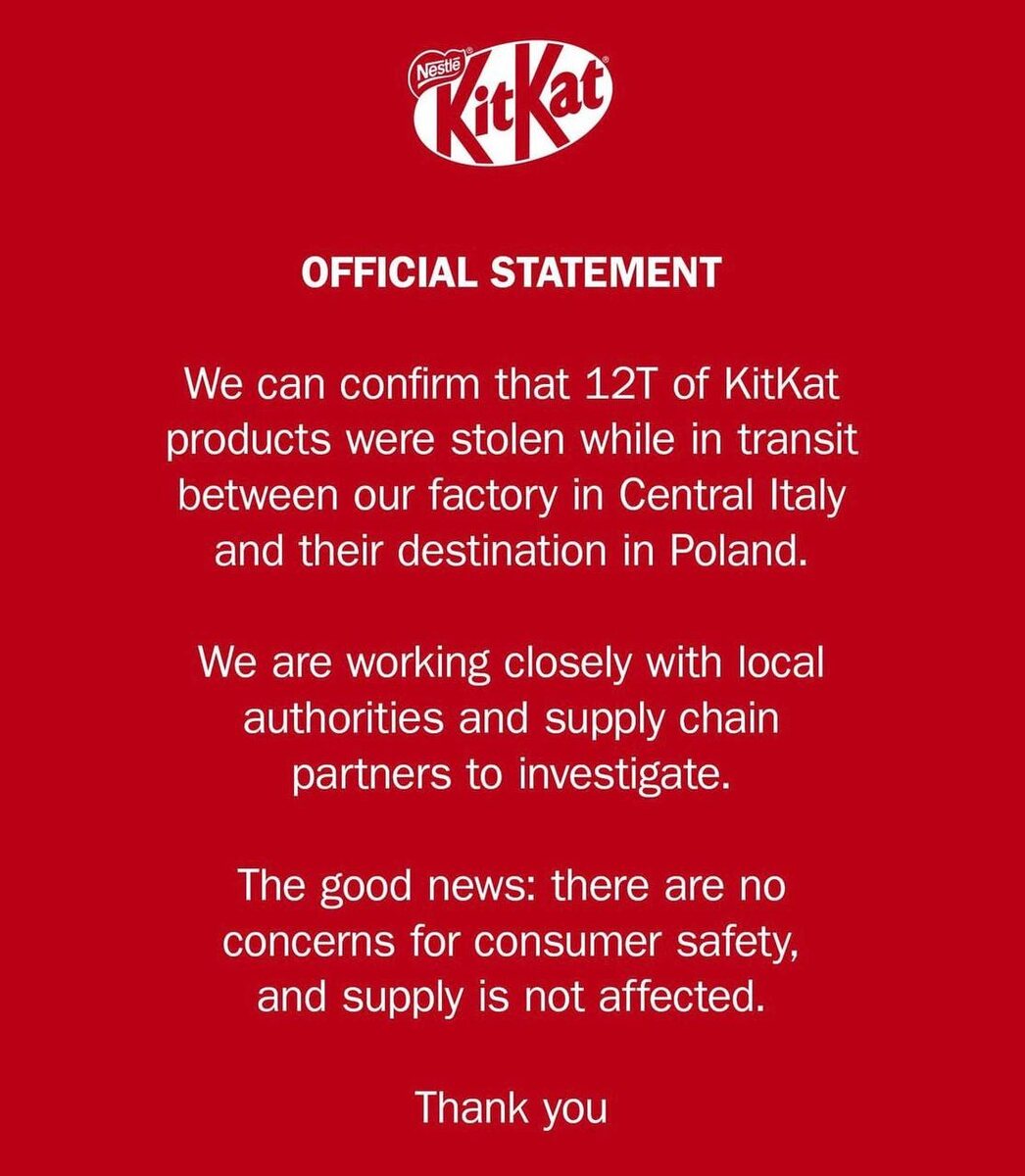 12 тонн киткатов было украдено где-то между Италией и Польшей, сообщает Kitkat