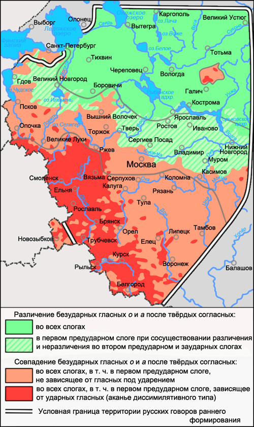 Как-то так совпало, что «граница между оканьем и аканьем» похожа на границу расселения вятичей... и границу земель, взятых Иваном Грозным в «Опричнину»: «Территория и ведомство опричнины постепенно увеличивались, охватив северные и отчасти центральные уезды, в большей степени удаленные от границ и богатые в промысловом отношении. В состав опричнины включили также юго-западные уезды: Можайский, Вяземский, Козельский, Белевский, Малоярославецкий и другие. Окружая Москву полукольцом, эти уезды давали возможность быстрой мобилизации опричного корпуса, который должен был быть наготове для исполнения воли государя. Из центральных уездов опричными стали Суздальский, а впоследствии Переславль-Залесский, Ростовский и Ярославский, где находились родовые гнезда княжат – потомков удельных князей, которых Иван IV считал опаснейшими противниками. Кроме того, в опричнину была отписана и часть территории самой Москвы (районы Арбата, Знаменки, Воздвиженки, Чертольской улицы), где разрешалось селиться лишь опричникам, земские же дворяне и посадские выводились со своих дворов».