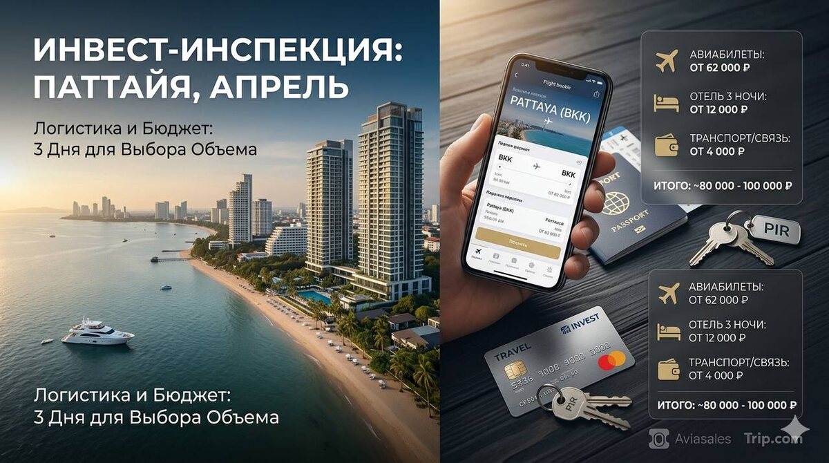 ? Личный визит - это финальный этап перед сделкой. В апреле рынок Таиланда входит в фазу подготовки к низкому сезону, что дает инвестору преимущество: выбор объектов больше, а девелоперы охотнее идут на переговоры по спецпредложениям. Разбираем бюджет поездки на 3-4 дня для проведения инспекции. 1. Авиасообщения Для тех, кто ценит время - прямые рейсы Аэрофлота и S7 до Бангкока. Для оптимизации бюджета - рейсы с пересадкой (через Китай). • Средняя стоимость: Билеты туда-обратно из Москвы на апрель начинаются от 62 000 – 75 000 ₽. • Где смотреть: Рекомендую мониторить актуальные цены и стыковки на Aviasales. 2. Размещение Для инвест-тура лучше выбирать отели в районах Джомтьен или Вонгамат - это основные локации с ликвидными объектами. • Рекомендация: Отели уровня 4* (например, Mercure Ocean или аналогичные бутик-резорты). • Бюджет: 3 ночи обойдутся в среднем в 12 000 – 16 000 ₽. • Бронирование: Удобнее всего использовать Trip.com - сервис стабильно принимает карты банков РФ и дает