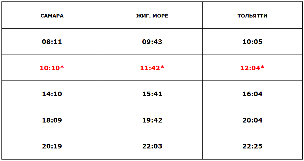 График движения электрички «Ласточка» на направлении Самара - Тольятти - Самара. Указано местное время отправки и прибытия. Обновление расписания: с 1 мая 2026 года вводится дополнительный рейс поезда «Ласточка».