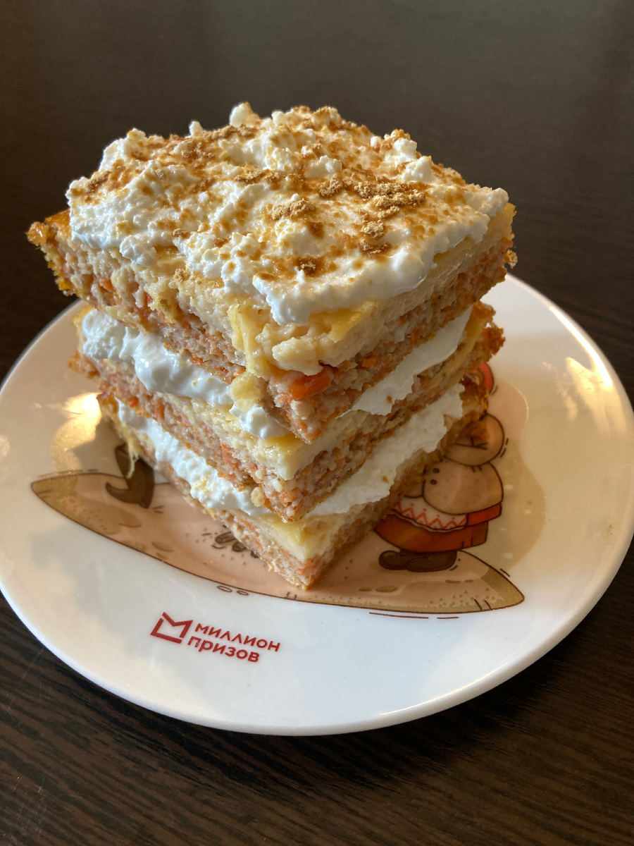 минут. Готовый корж полностью остудить. Для крема смешать творог с подсластителем. Разрезать