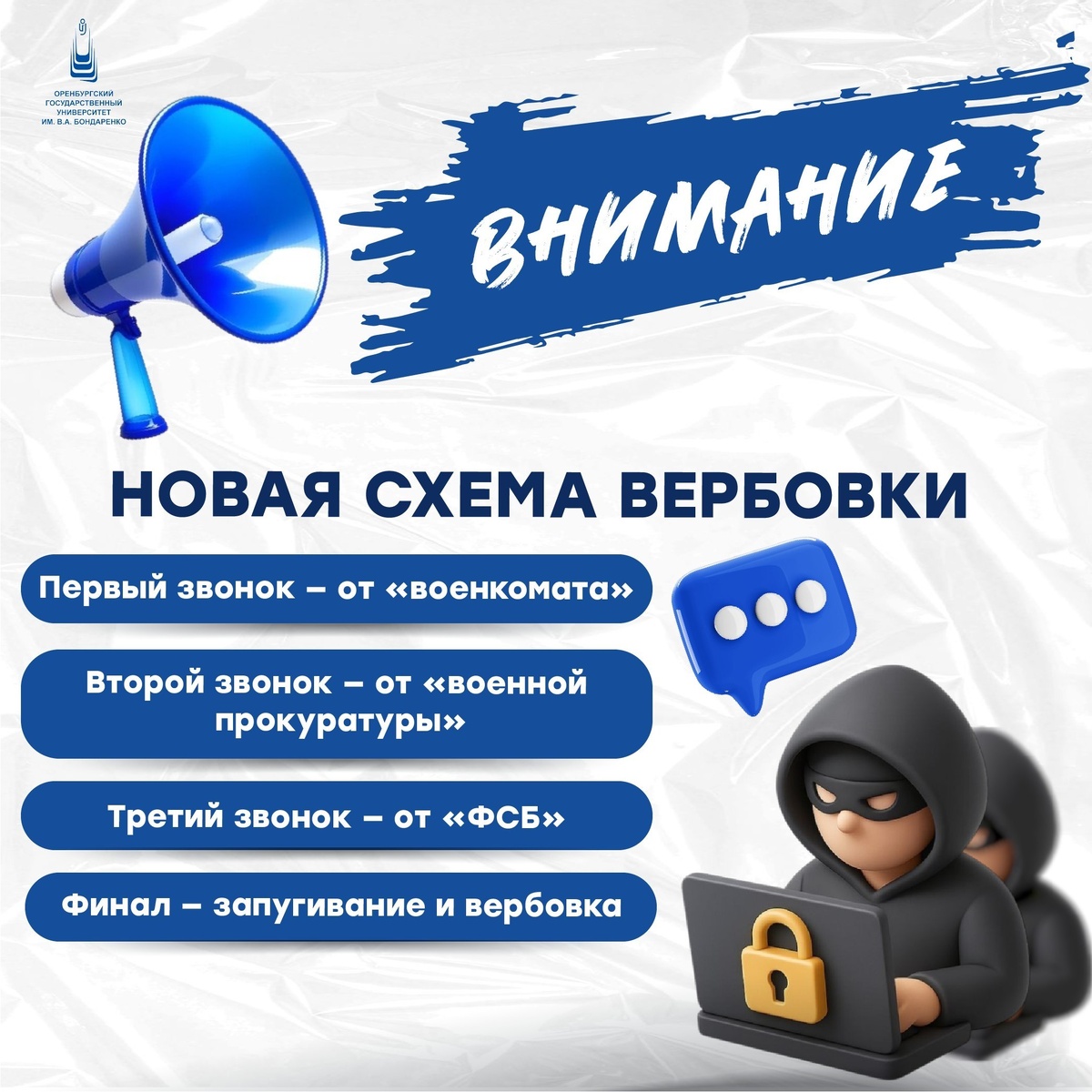 ❗️ Студенты, будьте бдительны! Сотрудниками УФСБ России по Оренбургской области предотвращена попытка вербовки студента одного из вузов региона. Мошенники действовали по многоступенчатой схеме, используя психологическое давление и методы социальной инженерии. Как это происходило: 💙 первый звонок — от «военкомата». Лже-сотрудник представляется, обращается по имени-отчеству, предлагает записаться на приём через электронную очередь и просит код из СМС якобы для подтверждения. На самом деле это код от Сбер ID жертвы; 💙 второй звонок — от «военной прокуратуры». Спустя 10–15 минут звонят с другого номера, сообщают, что деньги жертвы выведены на Украину, и возбуждено уголовное дело. Скоро свяжется «сотрудник ФСБ»; 💙 третий звонок — от «ФСБ». Сотрудник эмоционально поддерживает, но предупреждает о неразглашении, ссылаясь на ст. 310 УК РФ. Подробно расспрашивает о первом звонке, управляя вниманием; 💙 финал — запугивание и вербовка. Перечисляются статьи о финансировании терроризма, наприме