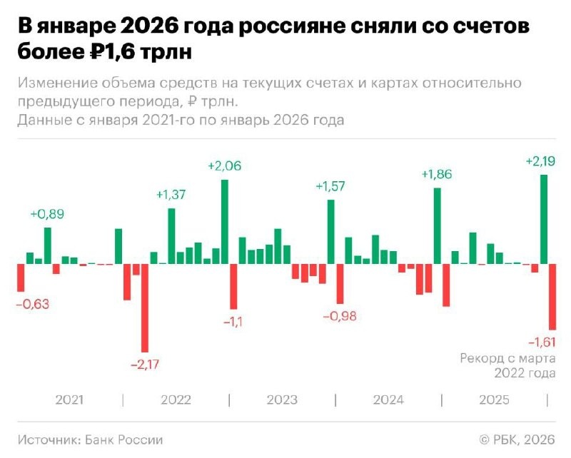 Россияне в январе сняли со счетов 1,61 трлн рублей. Больше было только в марте 2022 года.