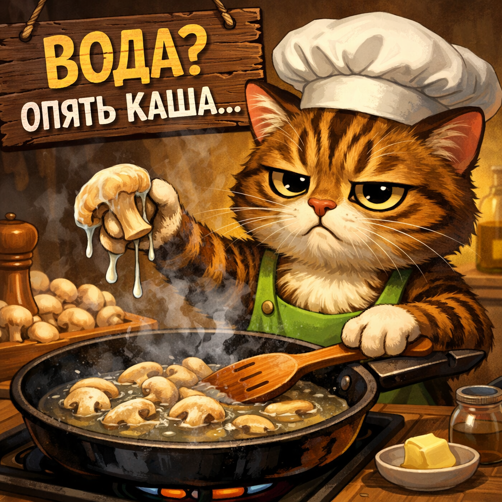 Это базовая вещь, о которой часто забывают. Грибы не похожи на картошку, лук или курицу. В них изначально очень высокий процент влаги. По сути, это продукт, который только притворяется плотным. На деле он наполнен водой, и как только попадает на нагрев, эта вода начинает выходить наружу.