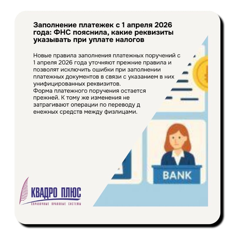 : ✅Заполнение платежек с 1 апреля 2026 года: ФНС пояснила, какие реквизиты указывать при уплате налогов ✅Потребительская рассрочка: новые требования ✅Ипотечное жилье при банкротстве: какие новшества заработают с 3 апреля 2026 года ✅Расширение перечня защищаемого имущества для граждан-должников ✅Новые правила продажи белого хлеба ✅Ужесточаются правила вывоза наличных рублей за границу ✅Импорт из стран ЕАЭС: изменили правила ввоза товаров ✅Завышать тарифы на коммуналку регионам не позволит ФАС ✅Заканчивается срок подачи уведомления о транспортно-экспедиционной деятельности ✅Изменяются формы документов, применяемых при расчетах по НДС