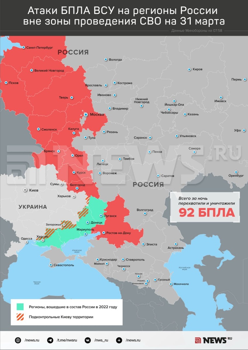 92 украинских дрона уничтожили силы ПВО за ночь над регионами России, сообщило Минобороны