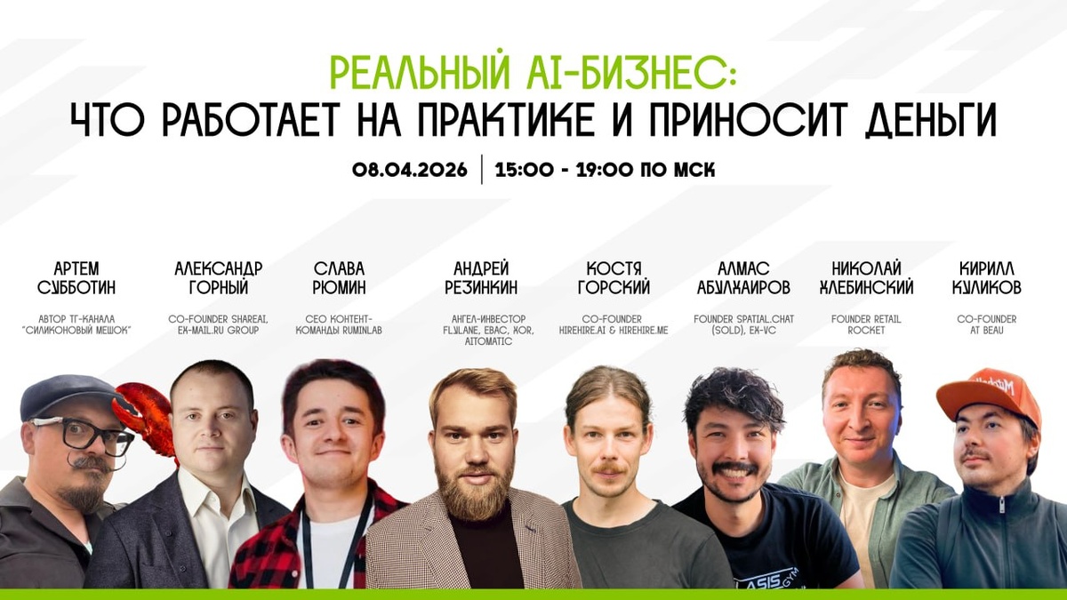 AI-хайп с прошлого года не просто не утихает — он активно набирает обороты. Пока из каждого утюга кричат, как алгоритмы вот-вот перевернут мир, мы решили собрать рабочую картину этого рынка без розовых очков. Встречаемся на конференции 8 апреля с 15:00 до 19:00 по Москве. 👉 Зарегистрироваться на конференцию За четыре часа обсудим все аспекты AI-бизнеса: от маркетинга и построения команды до поднятия раундов и юридических нюансов. Собрали крутых спикеров, темы которых дополняют и раскрывают друг друга: 15:00 — Кирилл Куликов, YC фаундер, автор канала kyrillic Что не так с AI-энтузиастами: хайп и реальность GenAI 15:30 — Александр Горный, ex-директор по стратегии Mail.Ru Group (VK), автор блога #стартапдня и канала GPT/ChatGPT/AI Central Александра Горного Перспективы регулирования AI в России 16:00 — Алмас Абулхаиров, предприниматель, который продал свой SaaS, автор канала Венчур по Понятиям Как зарабатывать на AI в SaaS 16:30 — Андрей Резинкин, ангел-инвестор в 20+ стартапах,