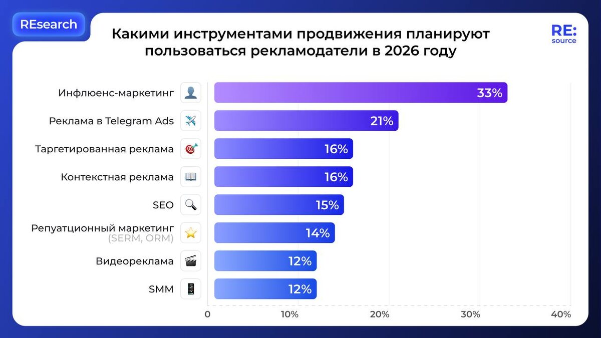 🔹🔹🔹 Треть рекламодателей начнет использовать инфлюенс-маркетинг в 2026 году В 2026 году 78% рекламодателей планируют протестировать минимум один новый инструмент продвижения. Наибольшую популярность собрал инфлюенс-маркетинг. Еще 21% рассматривают рекламу в Telegram Ads, а таргетированную и контекстную рекламу — по 16%. Источник: eLama, Roistat, SMMplanner, SpyWords, WOWBLOGGER (рус) #REsearch Подписаться на RE:source