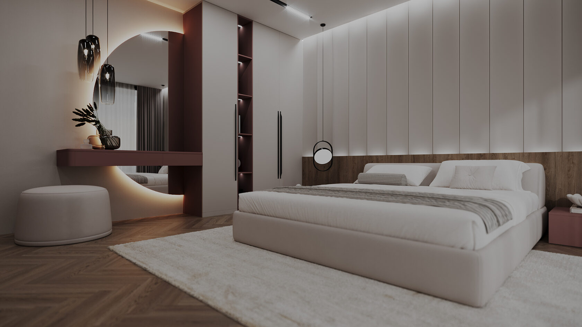 Это решение для спальни, которое экономит пространство. Встроенный распашной шкаф со стеллажным модулем, подвесным туалетным столиком и зеркалом с подсветкой решает сразу несколько задач: