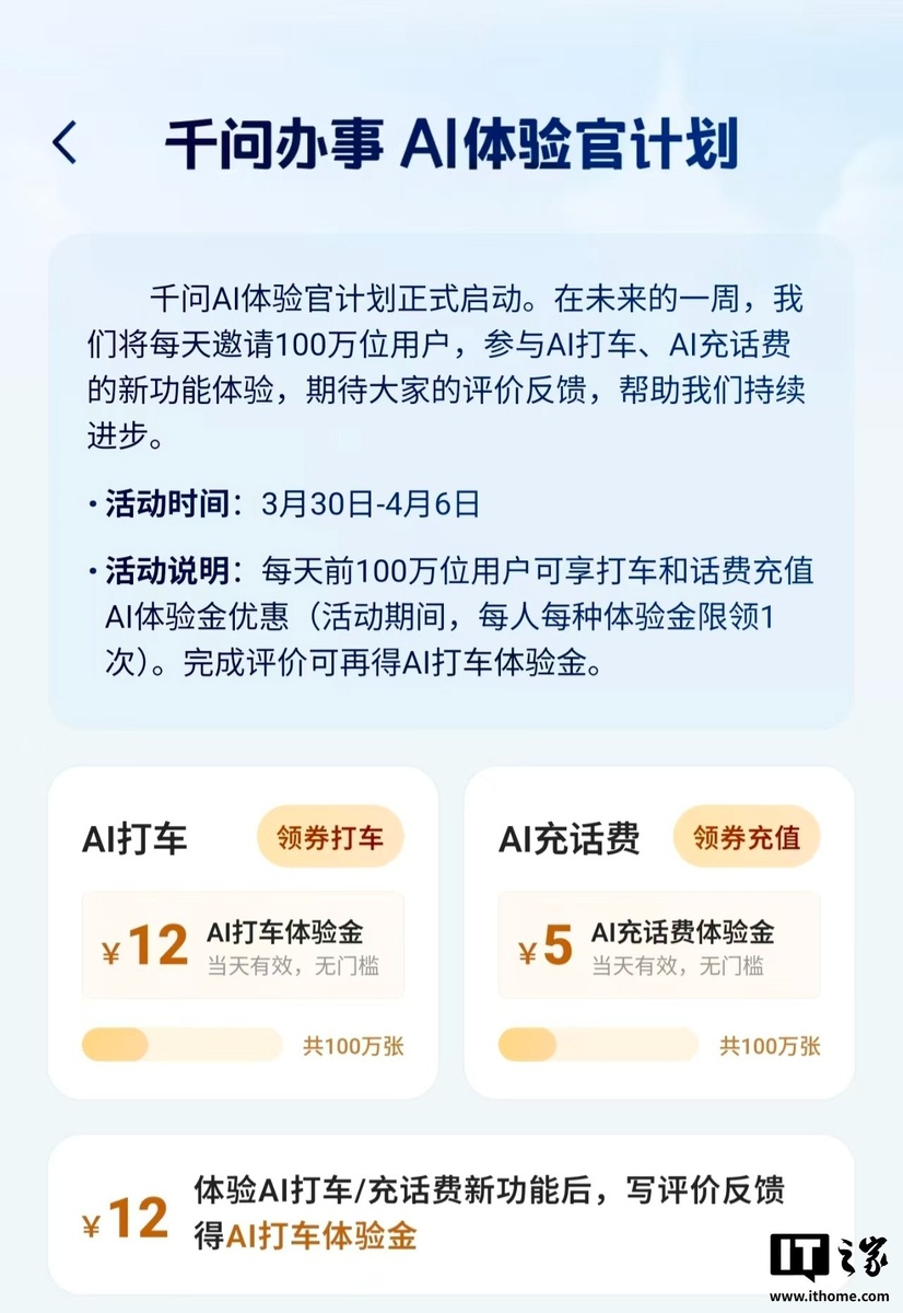 течение ограниченного времени. Согласно новостям IT House от 30 марта, Alipay объявила сегодня, что с 30 марта по 6 апреля вы можете получить пробные средства для пополнения баланса ИИ, открыв приложение Qianwen, и получить мгновенную скидку в размере 5 юаней на пополнение баланса. Согласно фактическому тесту IT House, откройте приложение Qianwen и нажмите «Qianwen Service» в верхнем левом углу, чтобы получить пробный бонус за вызов такси с использованием искусственного интеллекта в размере 12 юаней и пробный бонус за пополнение счета телефона с использованием искусственного интеллекта в размере 5 юаней. Пользователи могут получить немедленную скидку в размере 5 юаней, произнеся запрос на пополнение счета, например «Пополни счет на 50 для моего мобильного телефона». #Alibaba Подписывайтесь на t.me/chinese_ai_news и dzen.ru/chinese_ai