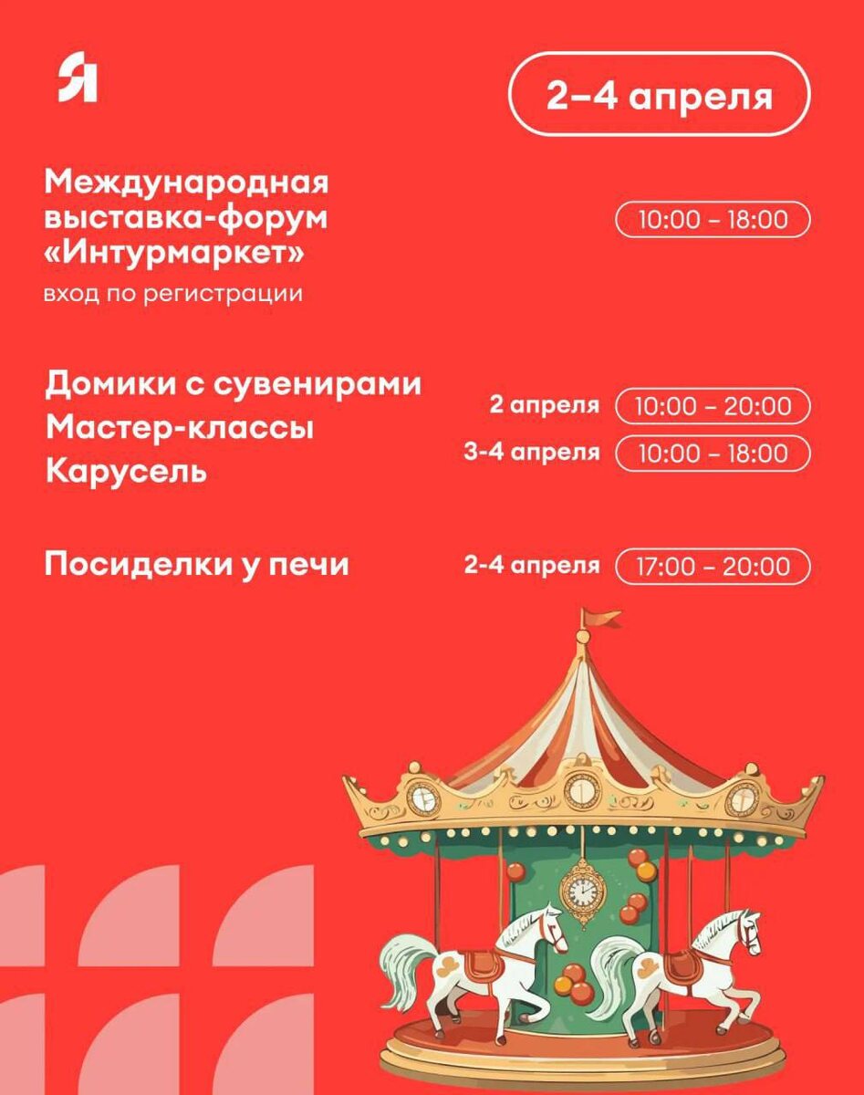 📍 Нижегородская ярмарка 🗓 2–4 апреля — домики с сувенирами — мастер-классы для детей и взрослых — карусель 🎠 — «посиделки у печи» с атмосферой уюта ⏰ 2 апреля: 10:00–20:00 3–4 апреля: 10:00–18:00 посиделки у печи: 17:00–20:00 Плюс внутри — выставка «Интурмаркет»: можно посмотреть направления для путешествий, пообщаться с туроператорами и даже поймать выгодные варианты 👉 Подписаться на нас в MAX 📲 .