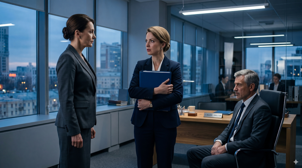 За директорским столом, привычно сложив руки перед собой, сидел Борис Константинович. Он выглядел немного виновато и одновременно так, как выглядит человек, который уже принял решение и теперь просто ждёт, пока буря пройдёт. А у окна, вполоборота к ней, стояла женщина. Лет сорока пяти, в безупречном сером костюме, с короткой стрижкой, с тем особым выражением лица, которое в корпоративном мире называют «железная леди».