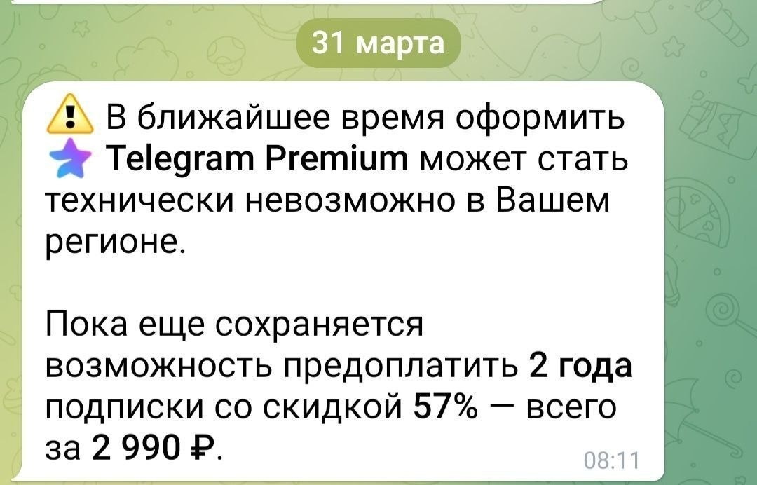 ?! Сервис предлагает пользователям оформить подписку сразу на 2 года, пока это возможно В ближайшее время пользователи из России либо не смогут оплатить товары и услуги банковскими картами, либо сам Телеграм отключит весь функционал для нас. Возможно, завтра вы уже не сможете зайти сюда и прочитать наши новости... вШбк 🇷🇺 Шебекино | 📝Написать нам | Мы в MAX | Мы в ВК