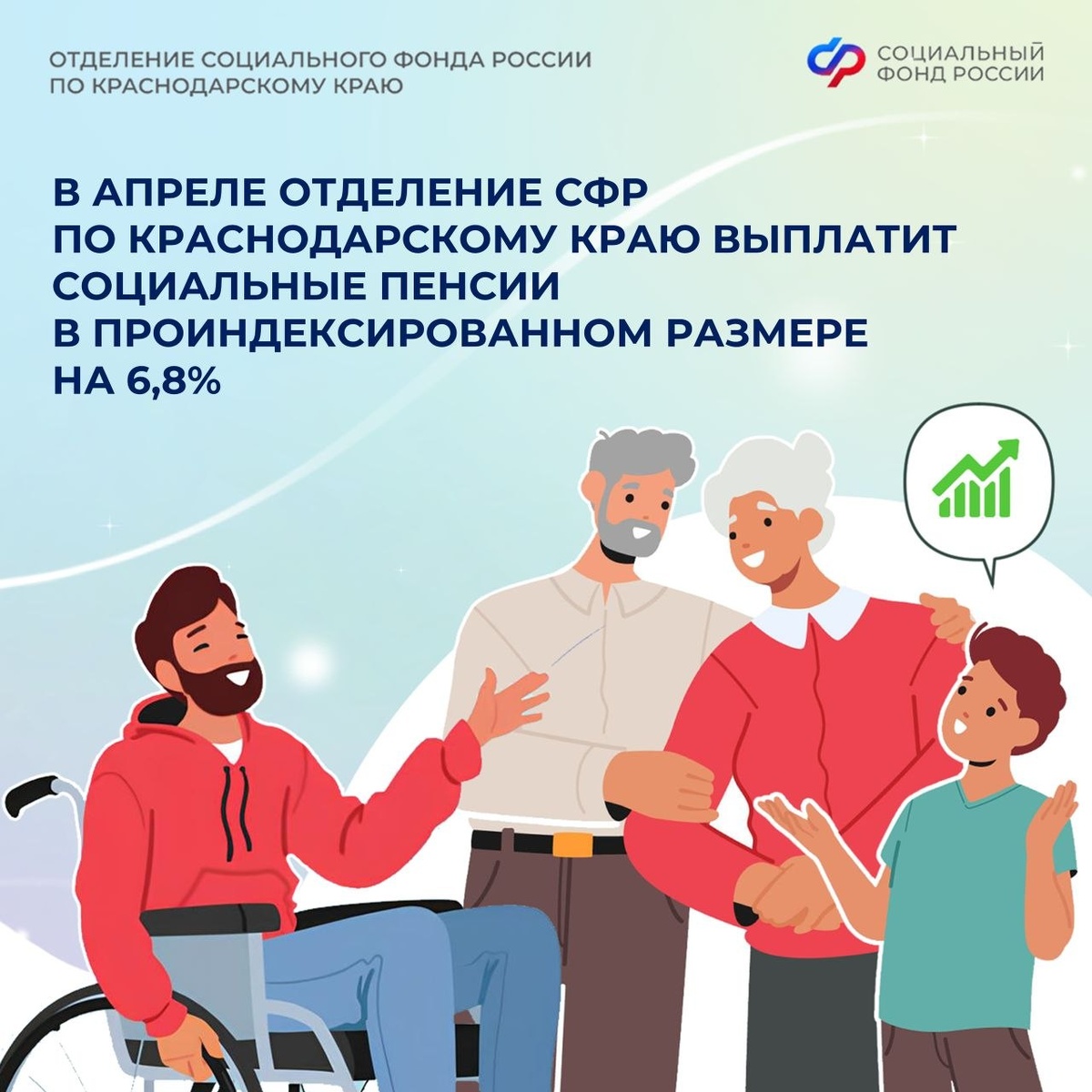 , включая социальные пенсии💸 ➡️ Индексация составит 6,8% — это связано с ростом прожиточного минимума пенсионера за прошлый год. Повышение коснётся: 👶 детей с инвалидностью, 👩🦽 инвалидов с детства I группы, а также отдельных категорий граждан, включая: ✔️ детей, у которых оба родителя неизвестны или тех, кто потерял одного/обоих родителей, ✔️ инвалидов Великой Отечественной войны и награждённых знаками «Жителю блокадного Ленинграда», «Жителю осаждённого Севастополя» и «Жителю осаждённого Сталинграда», ✔️ граждан, пострадавших от радиационных и техногенных катастроф, ✔️ тех, кто не имеет права на страховую пенсию и других. ❌ Никаких заявлений подавать не нужно! Повышенные пенсии придут по привычному графику. 💡 Средний размер социальной пенсии вырастет до 15,2 тысячи рублей, а для детей с инвалидностью — до 22,6 тысячи рублей. 📎 На территории Краснодарского края проживает 140,5 тысячи получателей социальной пенсии. ✔️ Напомним, что в январе страховые пенсии уже выросли на 7,