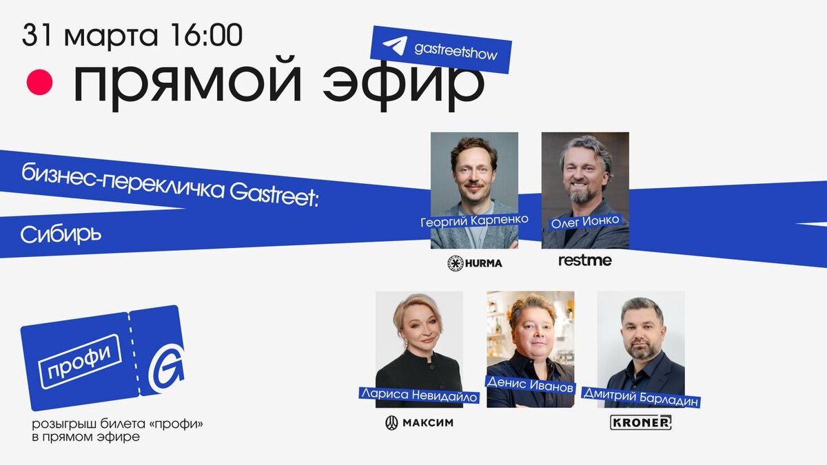 Иначе высок риск оказаться в информационном пузыре, а это сильно снижает оперативность реакций. Поэтому большое человеческое спасибо ресторанному шоу Gastreet за еженедельные бизнес-переклички с рестораторами со всей страны в прямом эфире. К примеру, 31 марта в фокусе внимания будет Сибирь. Игроки ресторанного рынка региона расскажут, с какими сложностями сталкиваются, как оптимизируют работу, какие технологии внедряют и какие результаты получают. Кто будет в эфире? • Георгий Карпенко — сооснователь и программный директор Gastreet, совладелец и директор по развитию группы компаний HURMA. • Лариса Невидайло (Тюмень) — ресторатор, основатель ресторанного холдинга «Максим», состоящего из 23 ресторанов, гастробистро, кейтеринга, кулинарной студии и кондитерской. • Олег Ионко (Новосибирск) — ресторатор, управляющий партнер и идеолог компании Restme. • Денис Иванов (Новосибирск) — ресторатор, основатель более 40 ресторанов в Новосибирске, Москве, Тюмени и Екатеринбурге (бренды: Beerma
