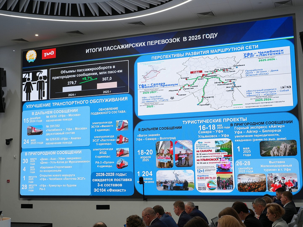 С 2026 года начнет курсировать новое межрегиональное железнодорожное сообщение из Уфы, связывающее столицу Башкортостана с Самарой и Магнитогорском. О планах рассказал заместитель начальника Куйбышевской железной дороги Дмитрий Новиков в ходе еженедельного совещания под председательством главы республики Радия Хабирова. Первый новый маршрут до Самары заработает уже в мае текущего года. Сообщение с Магнитогорском будет запущено во второй половине 2026 года, а в 2027 году планируется продление этой линии до Сибая. Дмитрий Новиков подчеркнул, что благодаря внедрению современных двухсистемных поездов "Финист", находящихся на стадии испытаний, время в пути от Уфы до Белорецка сократится до четырех часов. Также были представлены итоги прошлогодней деятельности железной дороги в регионе. В развитие инфраструктуры вложили 5 миллиардов рублей. Пассажиропоток в пригородном сообщении увеличился на 9,7%, а грузооборот превысил запланированные показатели на один процент. В рамках дальнейшего развит