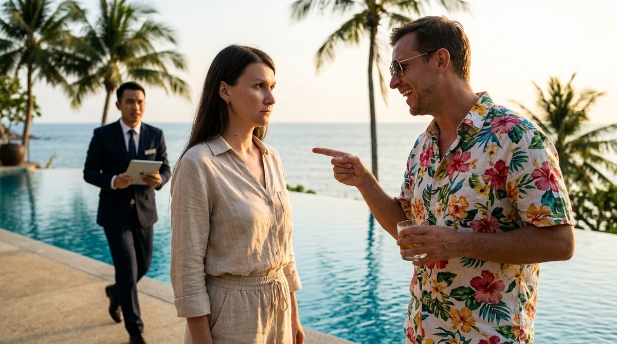 Вадим, тем временем, тяжело поднялся с шезлонга и подошел ко мне. От него пахло дорогим виски, хотя на часах было только одиннадцать утра.