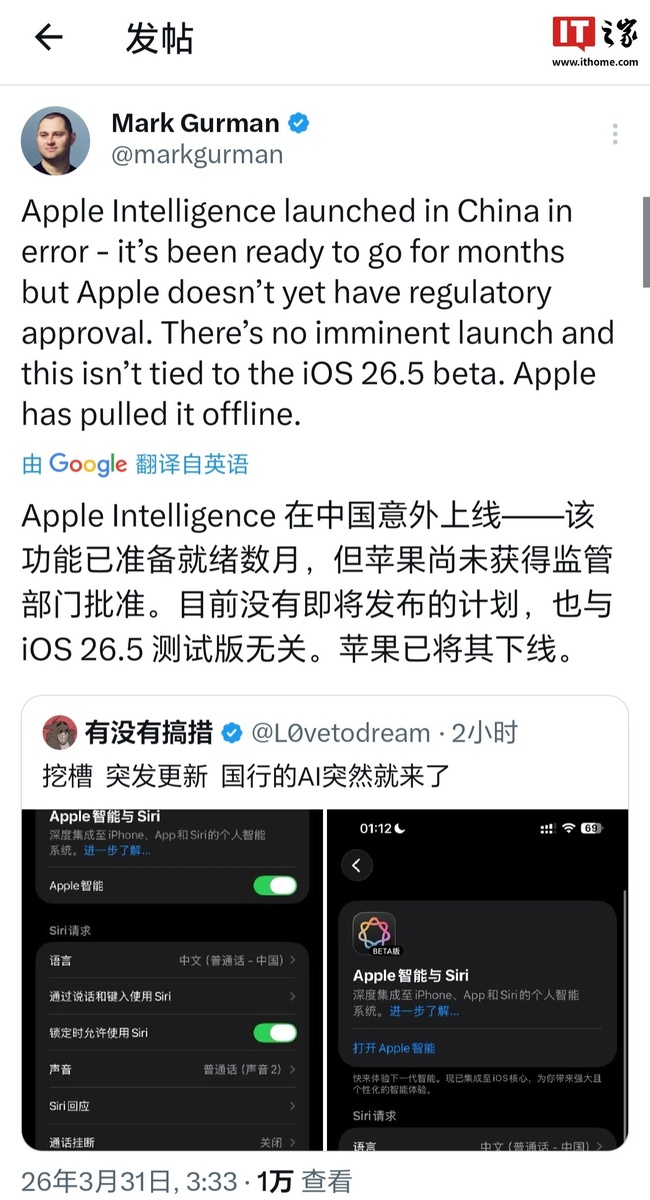IT House сообщил 31 марта, что, по словам репортера Bloomberg Марка Гурмана сегодня, Apple Intelligence была неожиданно запущена в Китае. Функция готова уже несколько месяцев, но Apple до сих пор не получила одобрения регулирующих органов. В настоящее время нет планов относительно предстоящего выпуска и ничего общего с бета-версией iOS 26.5. Apple отключила его. Подписывайтесь на t.me/chinese_ai_news и dzen.ru/chinese_ai