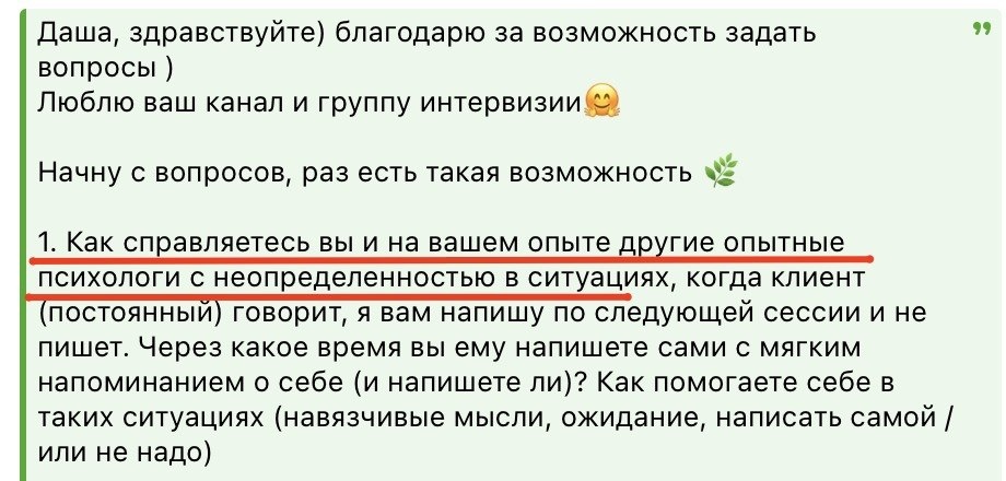 ?" Продолжаю отвечать на анонимные вопросы☝️ 🔸1. Я исключаю неопределенность из своей жизни, насколько могу. У меня не может возникнуть такой ситуации, т.к. я не договариваюсь на такие условия: "я вам напишу". Мне так не подходит. В моем информированном согласии прописано, что мы встречаемся раз в неделю (или 1 раз в 2 недели) в определенное время, которое закреплено за этим клиентом. Он об этом знает, также он знает правила отмен, переносов и выхода из терапии. 🔸2. Если бы я все-таки оказалась в такой ситуации, то писать бы сама не стала. Если у клиента не хватает мотивации соблюсти договоренность и написать, то где он возьмет мотивацию на работу? 🔸3. Как я себя поддерживаю если клиент выпал из терапии и ушел по-английски (да, такое бывает при всех договоренностях, в том числе)? Я иду на интервизию или супервизию, обрабатываю и закрываю для себя кейс в том же порядке, как если бы делала это вместе с клиентом. Спасибо за вопрос 🌸