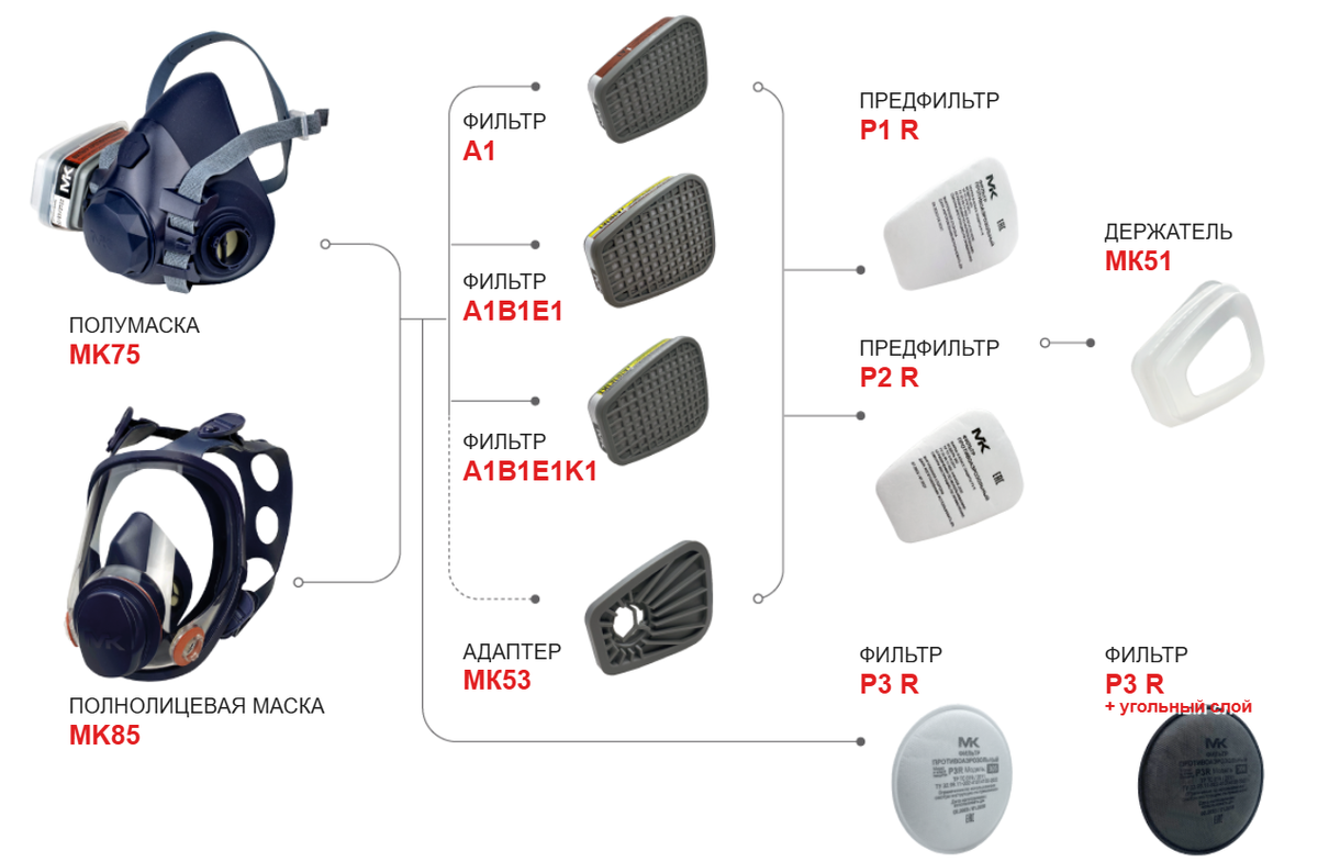 При выборе средств защиты дыхания важно смотреть на подход производителя в целом. Компания МК формирует свое предложение не как каталог разрозненных масок, а как продуманную систему защиты органов дыхания для широкого спектра задач. Эта система отвечает строгим стандартам и обеспечивает практический комфорт, что особенно важно для специалистов, ежедневно использующих респиратор на работе: сварщикам, малярам, строителям, работникам химических производств, монтажникам и представителям других профессий, связанных с пылью, аэрозолями или вредными газами. Основой служит линейка лицевых частей. Полнолицевая маска МК 85 обеспечивает максимальную защиту глаз и органов дыхания, что критически важно, например, для сварщика или при работе с едкими химикатами. Ее конструкция включает силиконовую обтюрацию для плотного прилегания, широкую линзу из поликарбоната и четырехточечное оголовье, которое можно точно отрегулировать. Для задач, где не нужна защита глаз, подходят полумаски МК 75 (силикон) и М