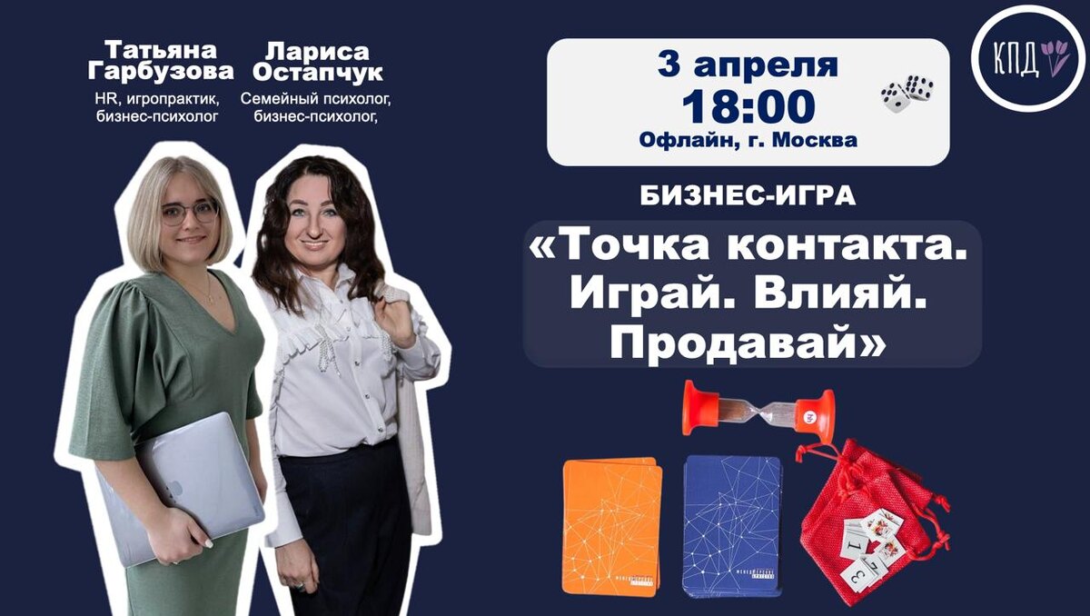 Если вы работаете в продажах, руководите командой или развиваете бизнес, вы точно знаете, сколько энергии уходит на то, чтобы: — договориться, — замотивировать, — продать и при этом не выгореть самому, сохранив команду в ресурсе. Об игре «Точка контакта» — это бизнес-игра, созданная на основе легендарной игры «Менеджерское братство» Максима Батырева, но с нашими авторскими дополнениями: — метафорические карты, — индивидуальная работа Это не скучный тренинг и не теория — это живая практика, где участники: 😘учатся эффективно коммуницировать и слышать друг друга КАК В ЖИЗНИ, 😘отрабатывают навыки влияния и лидерства, 😘раскрывают скрытые ресурсы команды и свои собственные, 😘получают честную и точную обратную связь, 😘и главное — учатся легко и уверенно решать сложные рабочие ситуации и ПРОДАВАТЬ. Кому это будет полезно: руководителям, предпринимателям и всем, кто каждый день ведет сложные переговоры и хочет делать это легче и увереннее. 🗓 Встречаемся 3 апреля в 18:00 📍 Формат: офл
