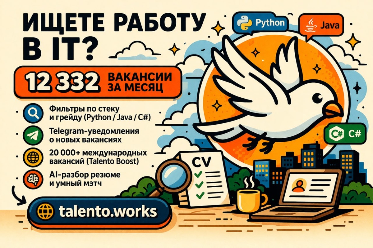 ? На talento.works сейчас опубликовано 12 332 вакансии за месяц. На сайте можно искать вакансии по стеку, грейду, формату работы, региону, зарплате и типу занятости. Есть фильтры по Junior / Middle / Senior / Lead, а также поиск по названию вакансии, навыкам и компании. Что полезно кандидату: 6️⃣ можно быстро отфильтровать вакансии по конкретному стеку, например Python, Java, C# 2️⃣ можно выбрать грейд и не тратить время на нерелевантные вакансии 3️⃣ еще пока можно бесплатно прожарить своё резюме есть AI-разбор резюме с реальным фидбэком 4️⃣ есть умный мэтч вашего резюме на выбранную вами вакансию + сопроводительные письма. БЕСПЛАТНО 5️⃣ и самое полезное: уведомления в Telegram о новых мэтчах, чтобы не заходить на сайт вручную каждый день и не пропускать подходящие вакансии Попробуйте сайт - лишним не будет точно. #рекомендация