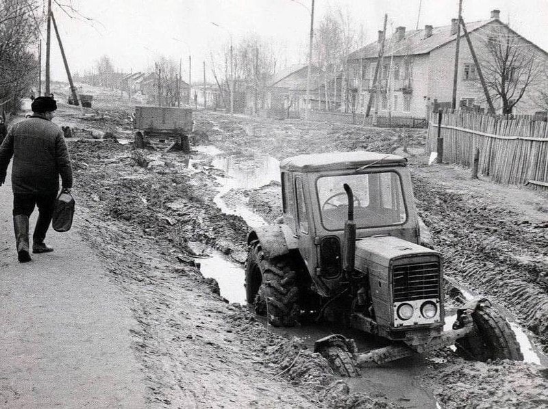 Но на самом деле — это кусочек той самой жизни, где люди шли вперёд, даже когда под ногами хлюпало, а дорога превращалась в настоящее испытание характера! 😄 Конец 1980-х, Ижевское село в Рязанской области. Мужик в сапогах идёт спокойно, будто вся эта вязкая каша — обычное дело. И ведь правда: наши деревни держались на терпении, смекалке и взаимовыручке. Когда трактор садился в грязь, это было не просто "ой, беда! ", а целое событие, требующее командного духа! 🚜 Все собирались, как на праздник, и вытаскивали технику, как будто это был не трактор, а застрявший друг на вечеринке. Вот так и жили, с юмором и упорством, превращая каждую трудность в возможность для сплочения!