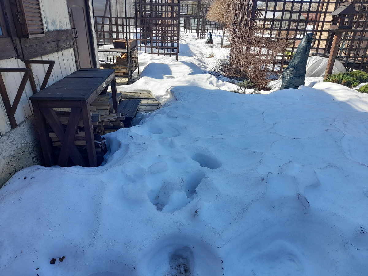 Пришли на дачу разведать обстановку. Снег очень быстро тает. Скоро начнется дачный сезон. У калитки снега еще очень много. Верхний слой до льда пошел в бочки. Эту воду я буду использовать для полива рассады. А дальше видны участки дорожек, куски цветников. За домом открылся газон. Кое-где появились первоцветы. Проходя мимо беседки с виноградом, обратила внимание на лавки. Весь оставшийся виноград осыпался на них. Взяла щетку и убрала. Виноград подсох и теперь не пачкается как осенью. При обшивке дома сайдингом пришлось демонтировать нашу систему водоснабжения. Еврокуб и опора остались на газоне. Сейчас трава пойдет в рост и если все это не убрать, будут проплешины. Перенесли на плитку. На огороде снега тоже много. Всю зиму переживала за теплицу. Поликарбонат частично разрушен, снег мы не чистили. Уже готовила себя к полной его замене, но все не так уж и плохо. Разрушений конечно стало больше, местами видно небо. Попробуем сделать заплаточный ремонт. У нас от прошлых проектов осталис
