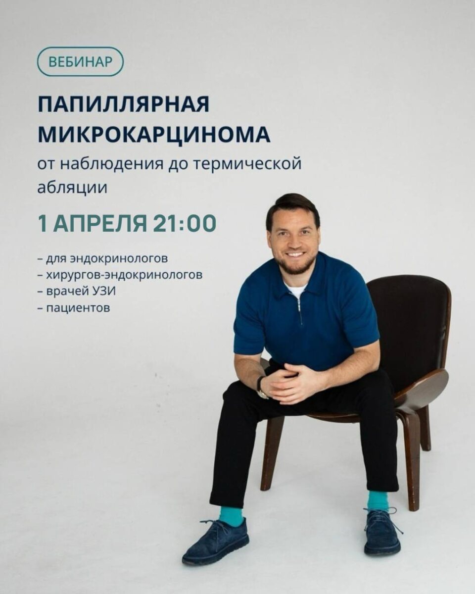 👆👆👆👆👆 Дорогие коллеги и читатели, вебинар «Папиллярная микрокарцинома: от наблюдения до термической абляции» переносится! ✅Вебинар пройдет 1 апреля в 21:00 по московскому времени!✅ Сегодня при выявлении микрокарциномы возможны разные тактики: наблюдение, хирургическое лечение и термическая абляция как альтернатива операции в определённых клинических ситуациях. На вебинаре мы подробно разберём, как выглядит микрокарцинома по УЗИ, в каких случаях можно рассматривать наблюдение, когда показано хирургическое лечение и кому может подойти абляция. 🩵 Этот вебинар будет полезен врачам-эндокринологам, хирургам, специалистам ультразвуковой диагностики, а также пациентам, которые хотят лучше разобраться в современных подходах к лечению малых форм рака щитовидной железы. 🩵 Если вы пропустили прошлый вебинар о роли генетических тестов в диагностике опухолей щитовидной железы, его можно посмотреть по ссылке. 🔹1 апреля (среда) 🔹21:00 по Мск Зарегистрироваться на вебинар https://thyroi