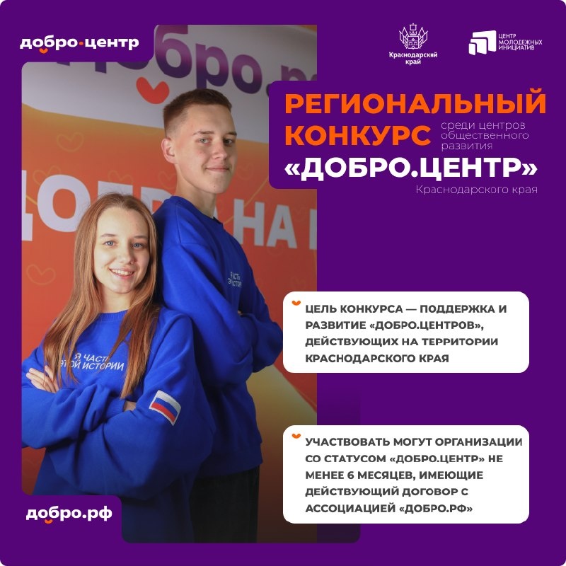 🧡 В Краснодарском крае стартовал региональный конкурс среди «Добро.Центров» ✅ Сегодня на Кубани работают 39 «Добро.Центров», и каждый из них становится точкой притяжения для активной молодёжи. Здесь находят единомышленников и запускают социально значимые инициативы. 📍 Ознакомиться с положением и анкетой можно по ссылке https://clck.ru/3SqFo6. ☎️ Заявки принимаются на email: dobrovoletskubani@yandex.ru Контактный номер: + 7 (929) 840-47-86. Конкурс проходит в рамках регионального проекта «Мы вместе» национального проекта «Молодёжь и дети».