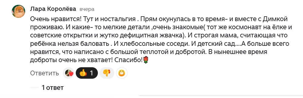 Внимательные читатели уже заметили, что мой канал получил новое имя - потому что я начала новую жизнь. Многие мне пеняли, что я в последнее время пишу редко. На самом деле я как раз очень много писала, только совсем другое - свой роман про наше поколение (и не только про наше - в нем есть герои всех возрастов). А еще в нем много музыки, которую я встраиваю в текст - потому что роман во многом именно про нее. Первые четыре главы я уже выложила на Дзене. Народу прочитало пока немного, но комментарии сплошь хорошие: Но на Дзене буду его выкладывать пореже, тут все же не тот формат, не для художественной он литературы. И, кстати, я вообще не понимаю, как вы его тут читаете в мобильной версии - сплошная реклама, которая закрывает весь текст. Рекомендую все же читать на моем сайте, там рекламы почти нет. Ну и там я буду добавлять новые главы в первую очередь. "Русский рок". Книга первая. «Мой адрес - Советский Союз». Книги я пишу под новым псевдонимом Ветлуга. Сначала я хотела стать Ветл