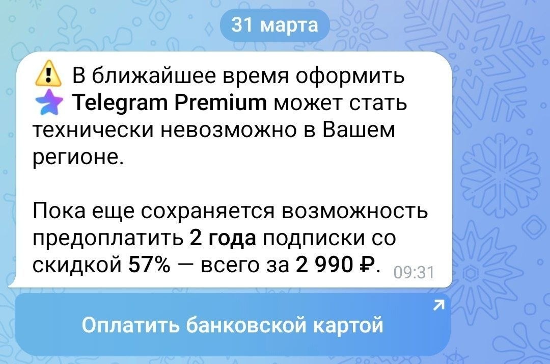 Telegram начал отправлять уведомления о потенциальных сложностях с оплатой Premium в России и предлагает оформить подписку сразу на два