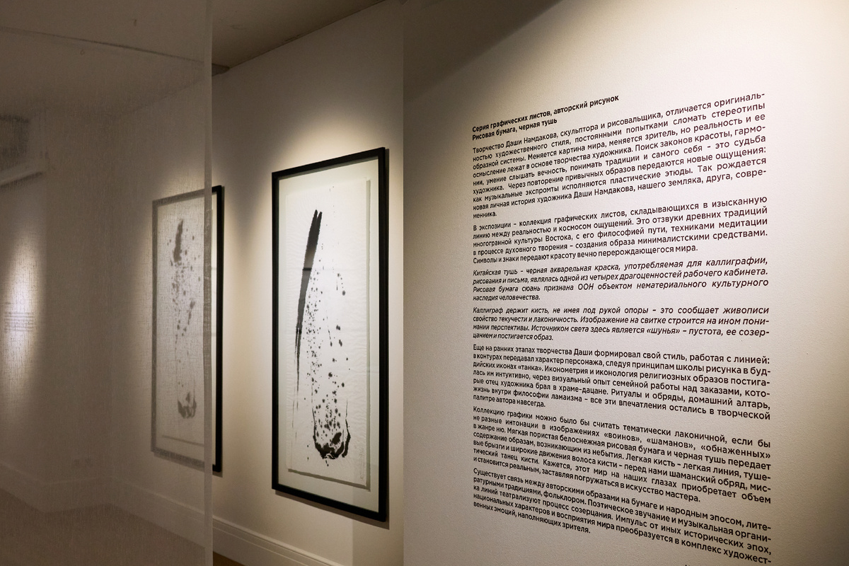 Даши Намдаков известен прежде всего как скульптор, но в основе его работ всегда лежит графическая идея, линия и рисунок. Графика мэтра существует по своим законам и заслуживает отдельного разговора. В проекте «Тушь» представлены совсем новые работы, выполненные черной тушью на рисовой бумаге. Рисовая бумага сюань изготавливается из рисовой соломы, коры тутового или сандалового дерева. Она включена ЮНЕСКО в список нематериального культурного наследия человечества. Китайская тушь на протяжении столетий входила в число четырех драгоценностей рабочего кабинета каллиграфа наравне с кистью, бумагой и емкостью для туши. Техника работы каллиграфа тоже традиционная: автор держит кисть без опоры на руку, движение начинается от плеча. Это придает линии текучесть и особую пластику. Изображение на свитке строится на ином понимании перспективы, где источником света выступает «шунья» – пустота, а образ постигается через ее созерцание. Мифический конь идеального мирового правителя, который спускается