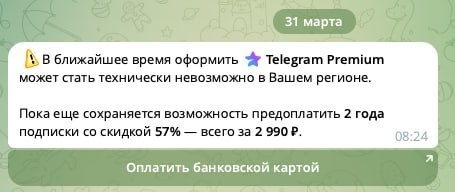 🐶 Telegram расылает пользователям из России уведомления с предупреждением о возможных трудностях с оплатой подписки Премиум. Мессенджер предлагает со скидкой предоплатить её на два года, «пока ещё сохраняется возможность»: В ближайшее время оформить Telegram Premium может стать технически невозможно в вашем регионе. Пока ещё сохраняется возможность предоплатить 2 года подписки со скидкой 57% – всего за 2 990₽ ❄ «Арктический Обозреватель»