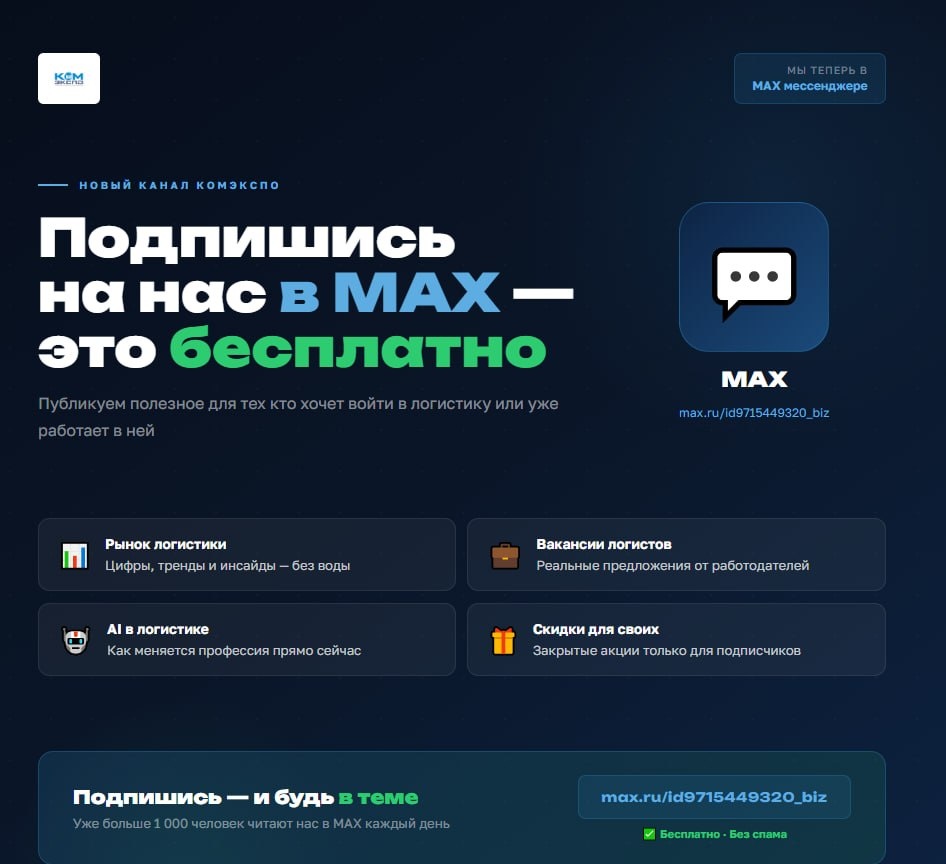 💬 Подписывайся — публикуем полезное для тех кто хочет войти в логистику или уже работает в ней: 📊 Рынок логистики — цифры и тренды без воды 💼 Вакансии логистов от работодателей 🤖 AI в логистике — как меняется профессия 🎁 Закрытые акции только для подписчиков Бесплатно. Без спама. Отписаться в любой момент. 👉 max.ru/id9715449320_biz