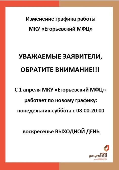 ! С 1 апреля МКУ «Егорьевский МФЦ» переходит на новый режим работы. Теперь получить услуги станет еще удобнее: ✅ понедельник – суббота: с 08:00 до 20:00 ❌ воскресенье: выходной день Планируйте свой визит заранее! #Егорьевск