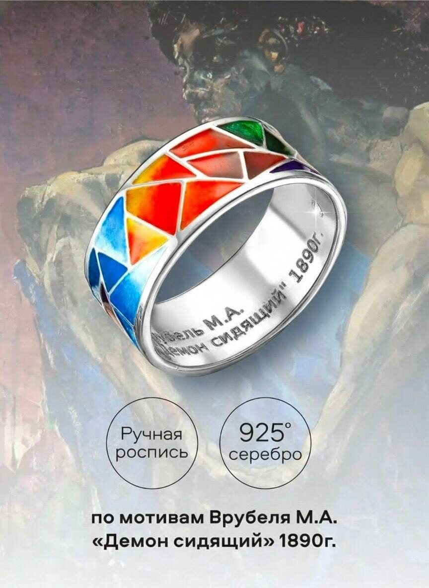 ! В этом комплекте оживает цветовая гамма знаменитого полотна Михаила Врубеля «Демон сидящий», написанного в 1890 году 🎨 Ручная роспись собрана из геометрических сегментов: треугольники и многогранники разделены тонкими серебряными перегородками, создавая эффект витража. 💎 Бриллиант спрятан с внутренней стороны кольца — как маленькая тайна, видимая только вам. Для уточнения стоимости и оформления заказа пишите в личные сообщения сообщества 💓 VK | MAX